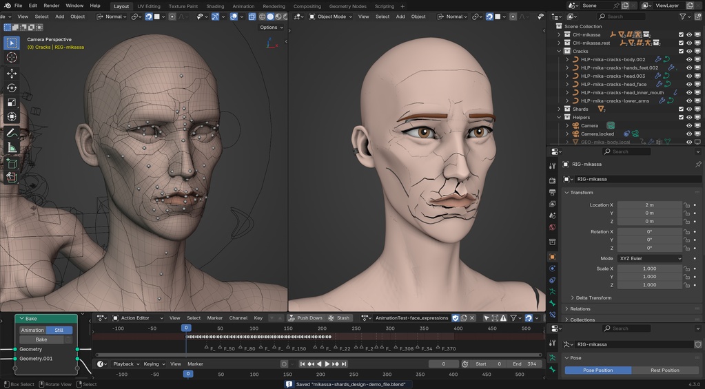 The cracks are defined by drawing curves onto the T-Posed body GEO-mika-body.local-t_pose (left viewport). All curve objects are placed in a collection called 'Cracks', which is used as an input for the Geometry Nodes modifiers that generates the shards.