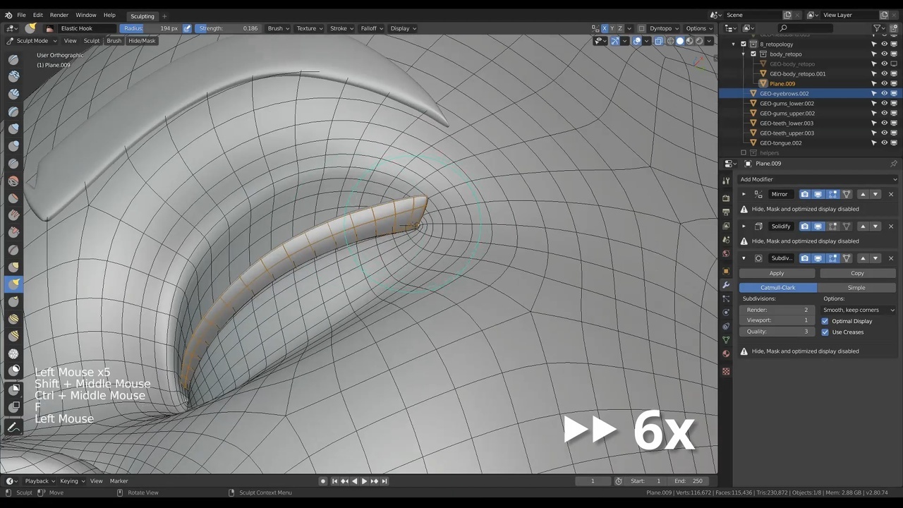 For this timelapse video it's all about cleaning up and modeling additional head objects like the teeth, gums, tongue, eyes, eyebrows and eyelashes. Well modeled landmarks are important for this step.