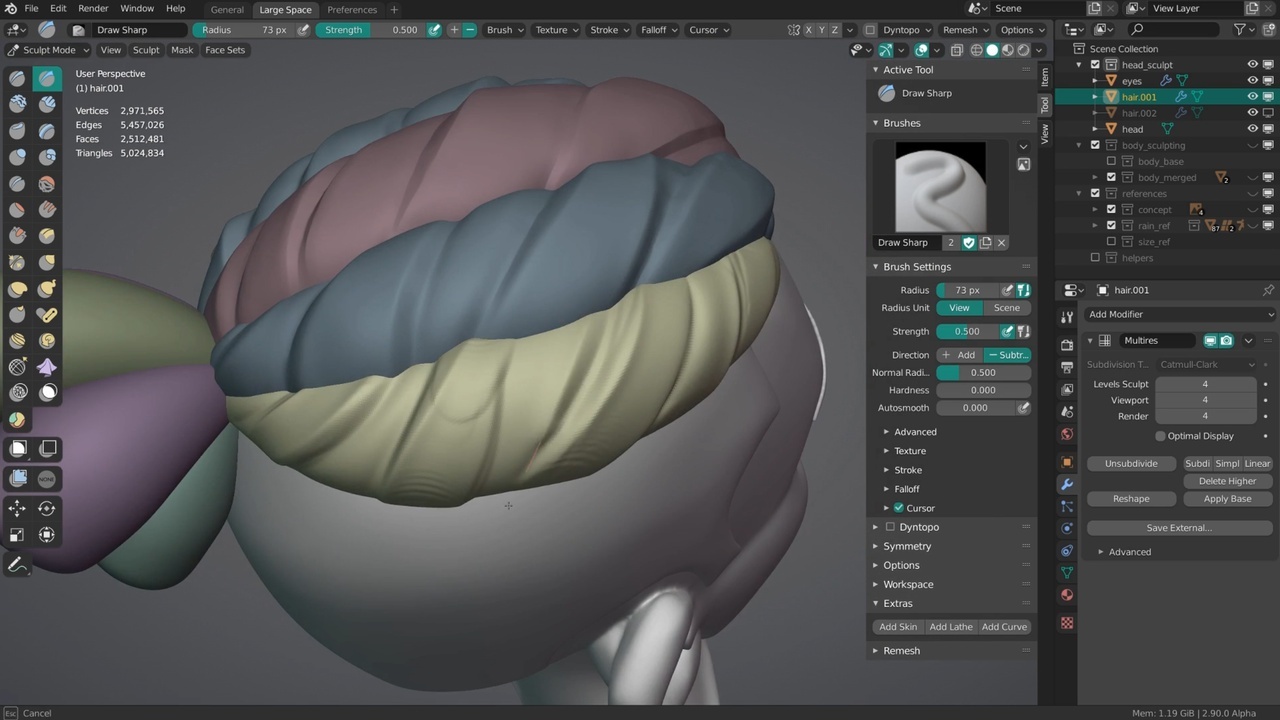 Luckily since the hands and hair were already made with clean topology I was able to use the multiresolution modifier there already to increase the amount of detail and polish. I also highly recommend to sculpt with flat shaded surfaces since that gives you a better idea of what your actual geometry is instead of getting a fake smoothed result.
