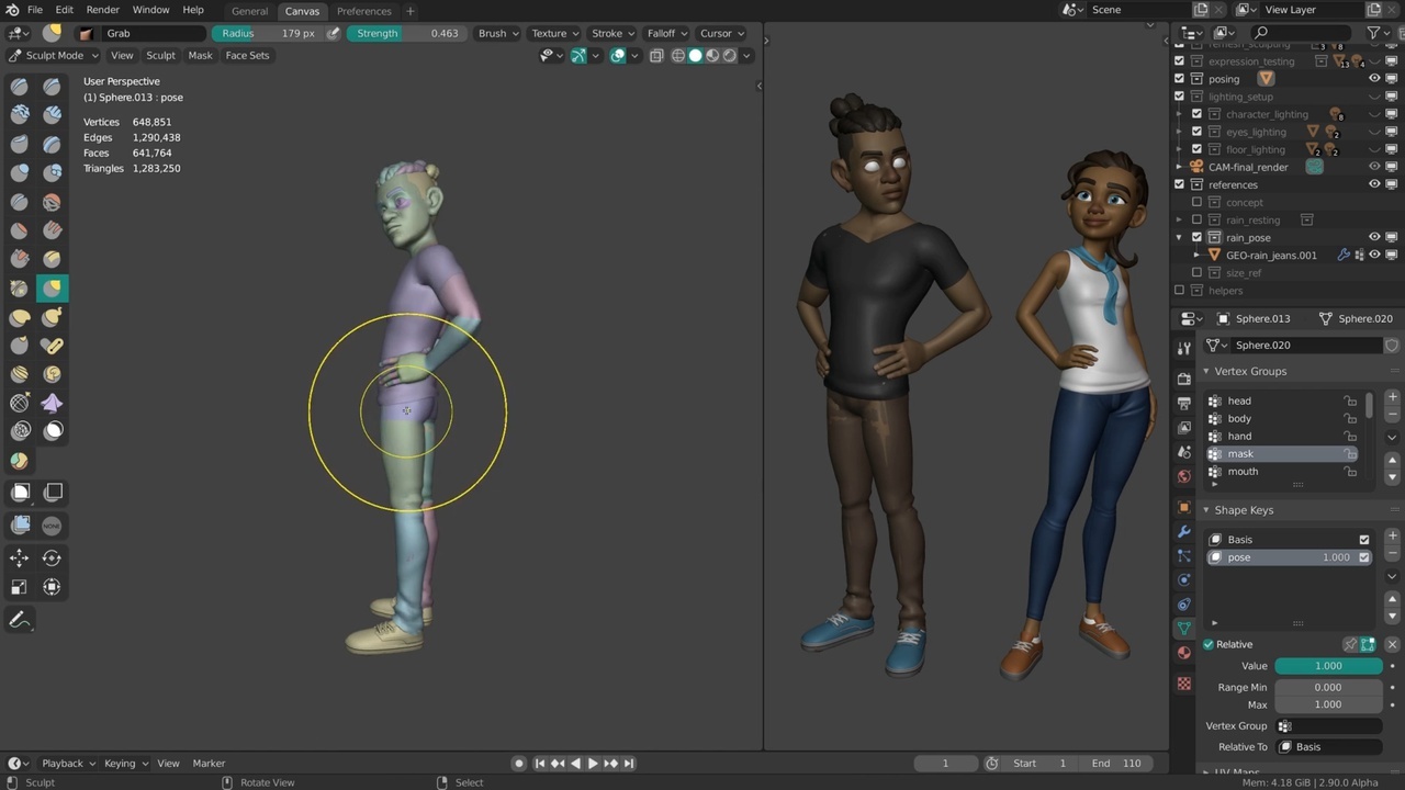 Nowadays I would usethe pose brush more since it can deform disconnected meshes but the most efficient workflow most of the time with Snow was to mask off sections and use the transform tools to rotate limbs. Mask expand (Shift A) is also a functionality I used a lot for this. At first I kept the symmetry to save some time but eventually I started to pose him in more detail. All of this was also done with shapekeys so that I could work non-destructively and roll back changes if I needed to. Again: Make sure you only sculpt on the base resolution since shapekayes work there.