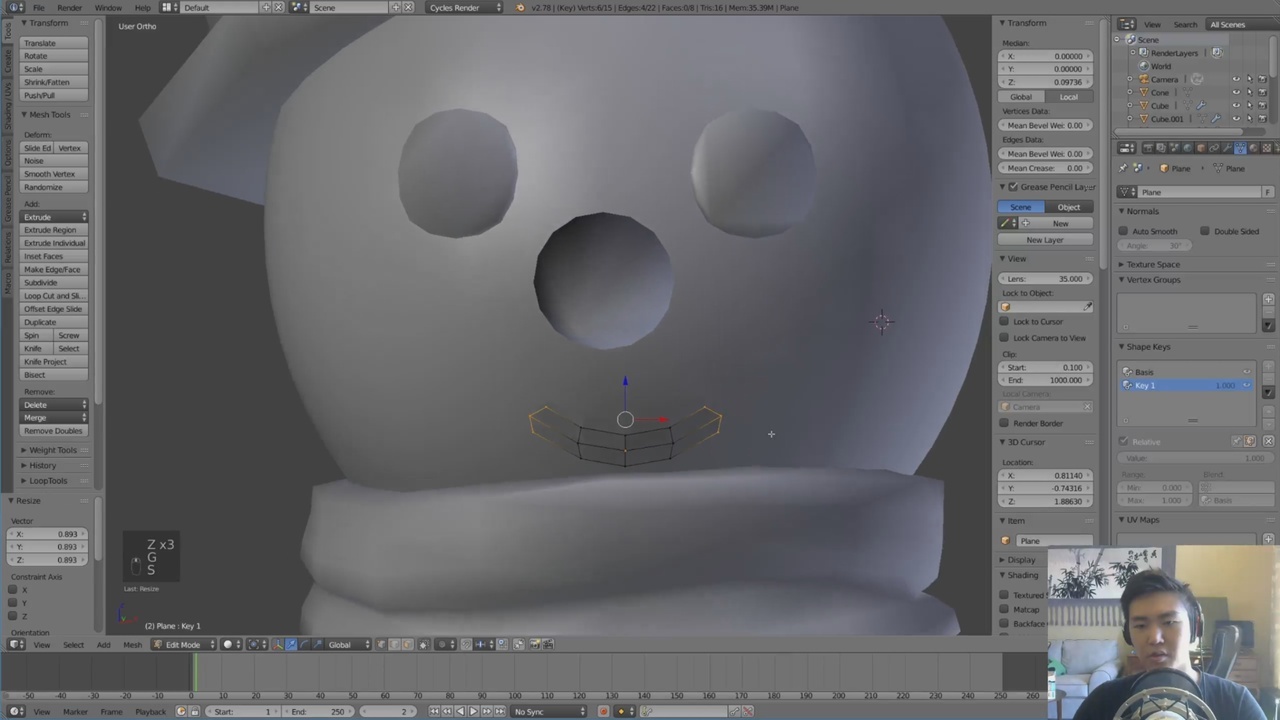Here we will begin working on forming shape keys for the mouth. This will give us nice simple rigging for facial animation.