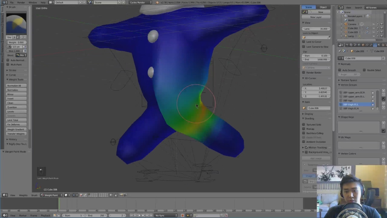 Here we do some fine tuning for the rig. By manually weight painting, we have a bit more control over the influence of each bone on the geometry.