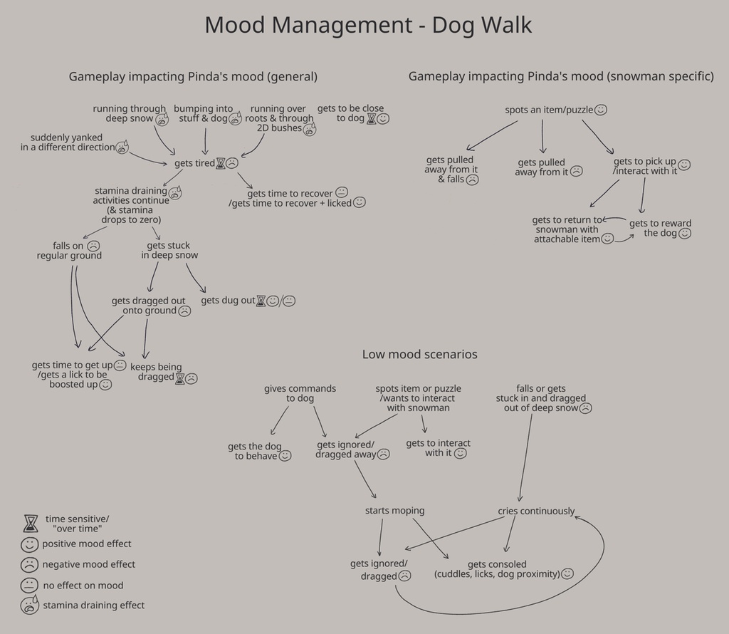 要建立的關鍵元素是兩個角色的動畫樹。由於它們需要相互交互,因此我們必須制定清晰的「遊戲邏輯」。 Pinda(小孩)可以在遊戲中體驗到不同的情緒,從而影響玩家與他們的互動方式——是繼續玩遊戲,還是只是坐下來哭泣。一個動作會引起一個反應,所有這些互動都需要仔細規劃,以了解遊戲的整體功能以及每個角色需要哪些動畫才能創造出可信的動態。
