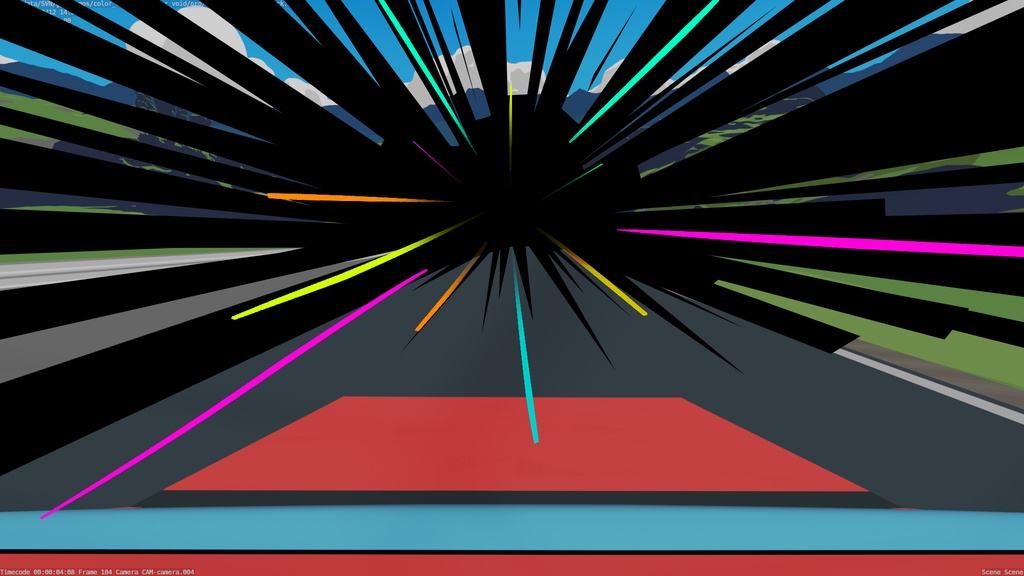 透過在車身安裝攝影機——就像人們在賽道日或電影中所做的那樣——我們可以獲得整個序列的清晰、快節奏的剪輯。但後來它與「攝影車」結合,追蹤汽車的運動,在移動和靜態攝影機之間切換。我不想使用運動模糊,而是想添加與背景顏色相符的“速度帶”來指示速度。事實證明,在所有鏡頭中放置它要複雜得多,這就是為什麼它只出現在第三個鏡頭中。