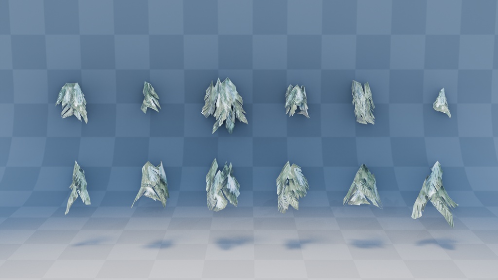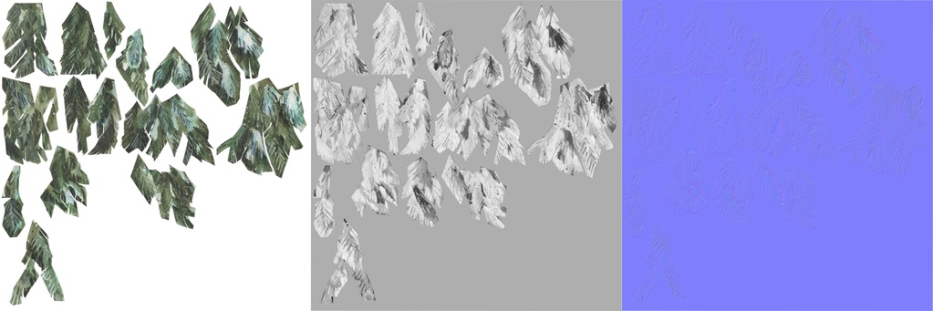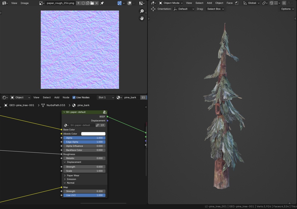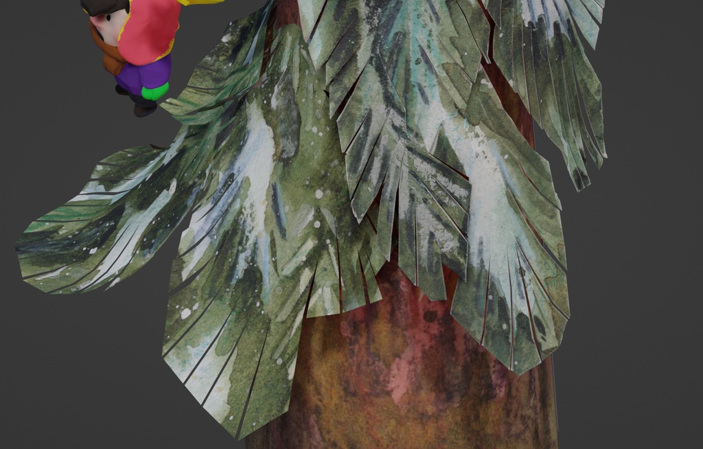 第一個模型以簡單的飛鏢形狀為基底,上面分佈著平面切口。松樹切口是將單獨的紙藝元素放置在掃描板上,然後在 Krita 中裁剪而成的。這個過程有點繁瑣,所以我們嘗試在某些情況下使用不同的紙張背景來將某些值轉換為 Alpha 通道。這種方法並不完美,但對於撕得很薄的紙張來說效果很好。