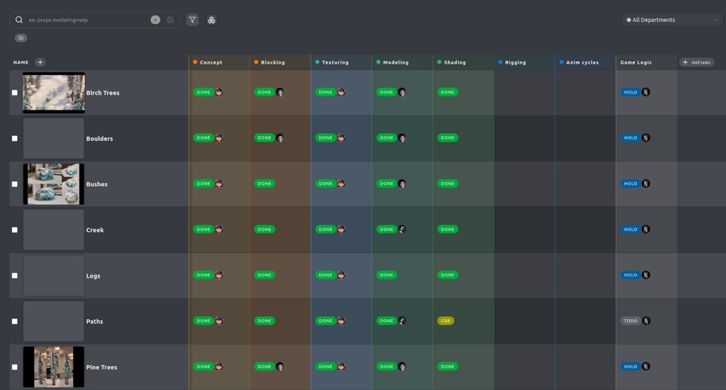 在開始製作資產之前,我們查看了一些現有的概念作品,以確定我們需要什麼樣的資產。最初的資產包括松樹、樺樹、灌木叢、巨石和一些道具。道具和圖書館資產的差別在於角色和資產之間的互動。鏟子、網球和交通錐都是道具,它們都有裝備,可以製作動畫,而巨石和樹木則是可重複使用的庫資產,它們被放置在整個環境中。在我們的製作管理工具 Kitsu 上,我們會添加這些資產,以追蹤其狀態並傳達任何反饋/修改。