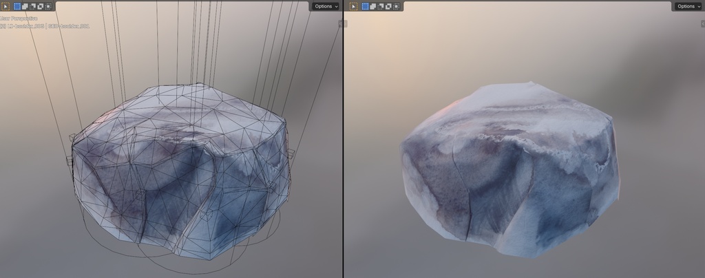 創建幾個松木切面後,就該將它們添加到樹根了。我的第一反應是手動將它們作為實例放置,但我認為速度更重要,所以我使用了幾何節點來散佈松木碎片。最終,程式散射被移除,出於特定的藝術指導和優化考慮,我決定手動放置。在這個項目中,對於大多數物體,我喜歡添加“三角測量”修改器來觀察模型的表現。這意味著最終幾何體的結果與導出時所應用的修改器完全相同。我們還決定添加「加權法線」修改器,以避免烘焙法線貼圖,從而在支撐環上花費更多渲染預算,儘管許多最終影像的細節得益於手繪的反照率貼圖。