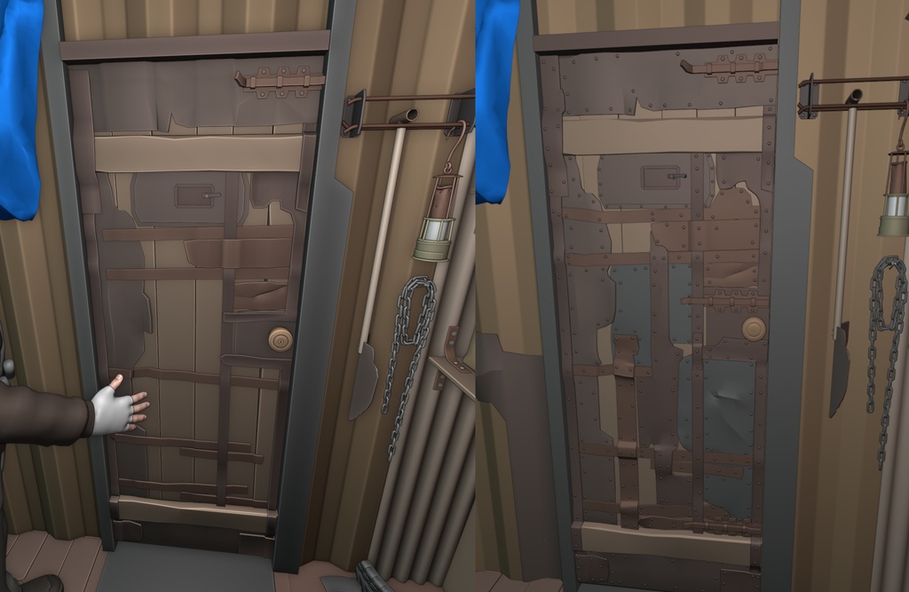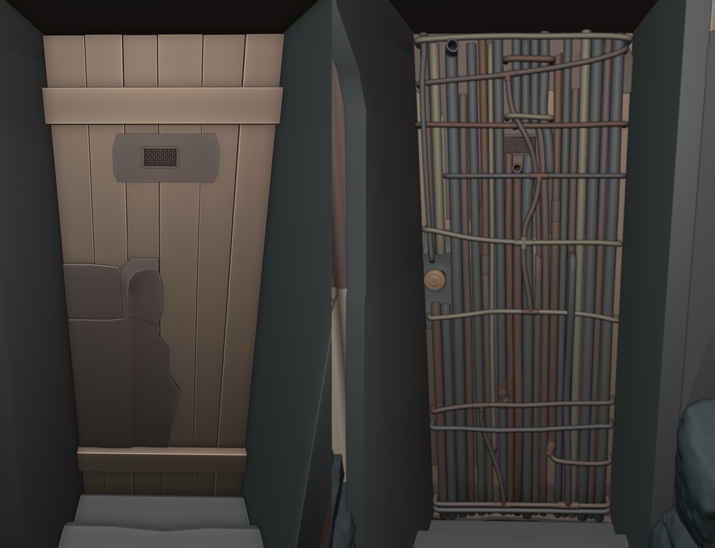 入口處有一個快速儲物架,可以存放外出最常用的工具,例如油燈、簡易鏟子、折疊樓梯和鏈條。還有一個儲藏室,裡面有裝滿垃圾和多餘的建築材料的紙箱。門採用金屬板加固,並用螺栓固定在帶有護欄的木製框架上。從外面看,門用夾在一起的金屬管加固。