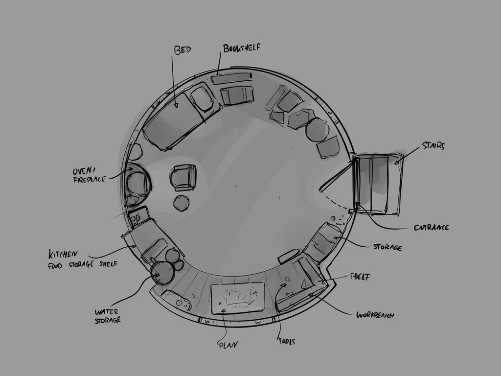 對我來說,佈景設計的最佳方法是從平面圖開始。最初,我的 一樓平面圖 是圓形的:是為了創造一個更有機的環境,而不是工廠那種棱角分明的設計。設計更讓人聯想到蒙古包。但是當 Hjalti 看到第一個障礙物時,他立即指出,它們看起來不像冰島的,而且他從未在那裡見過這樣的建築!