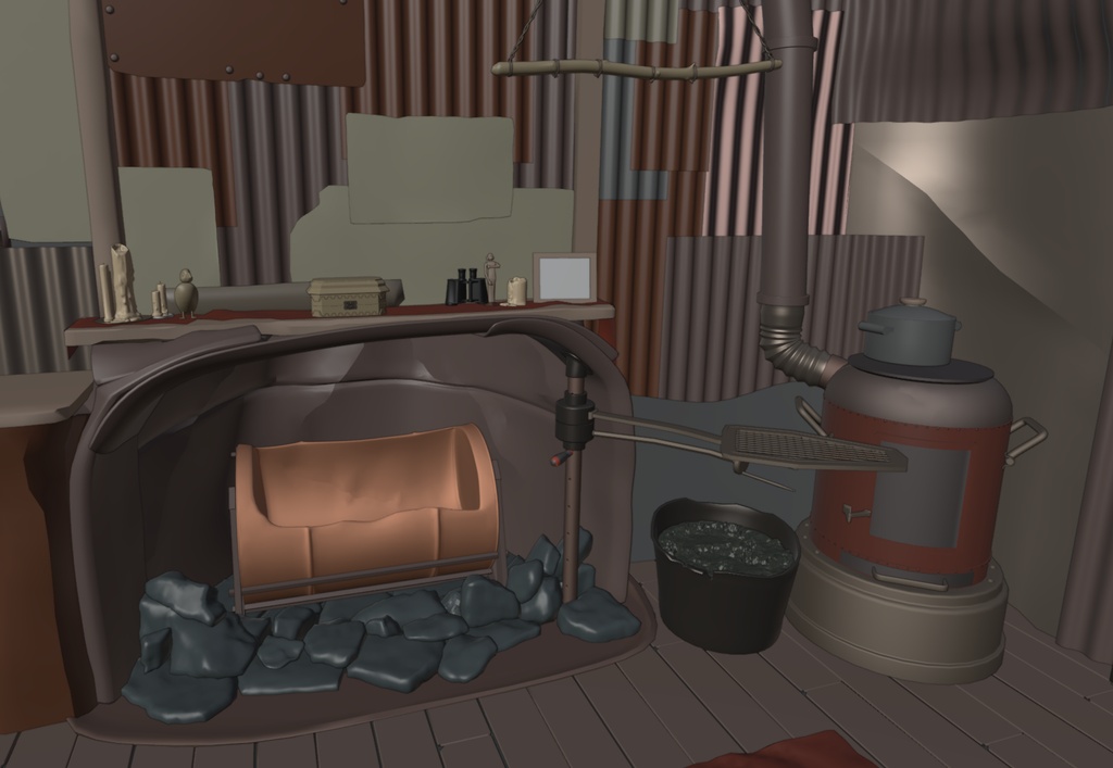 壁爐由彎曲的金屬板釘在一起,地板上放著一個切割好的桶,裡面放著一些草皮或木材作為燃料。旁邊是烤食物的烹飪工具和爐子。壁爐架上擺放著一些個人紀念品和更多細節的物品。