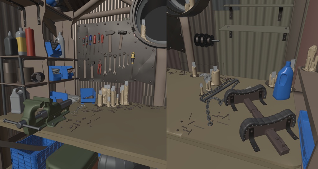 這是一個重要的方面,它強化了反烏托邦的背景感,艾納爾和民眾用他們能找到的東西建造了家園。但我父親的農場也是我們經常修修補補的地方,它也被用作參考,尤其是那個凌亂的工作台!拍攝的照片非常適合作為結構和紋理的參考。