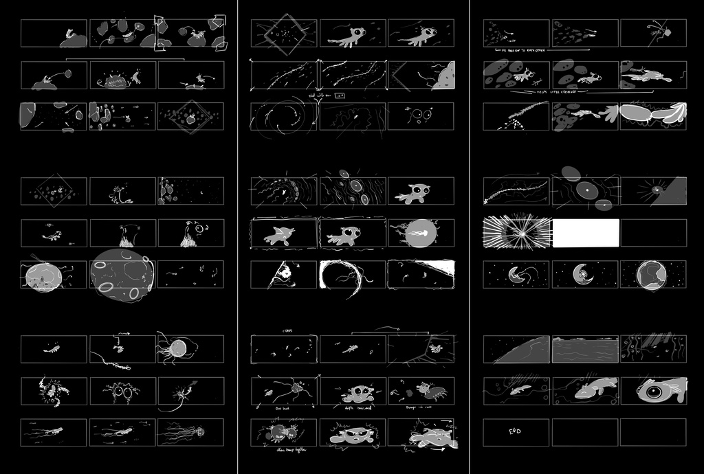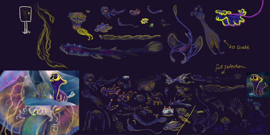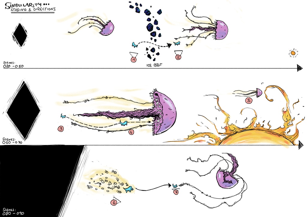 在整體結構和節奏更加充實之後,另一個顯而易見的事實是,Critter 需要一個稍長的介紹,讓我們稍微了解一下它在混亂爆發前的生活。根據團隊的建議,我還在黑洞出現之前設定了巨型水母。這應該能讓我們有更多的時間去理解舞台佈置和角色。