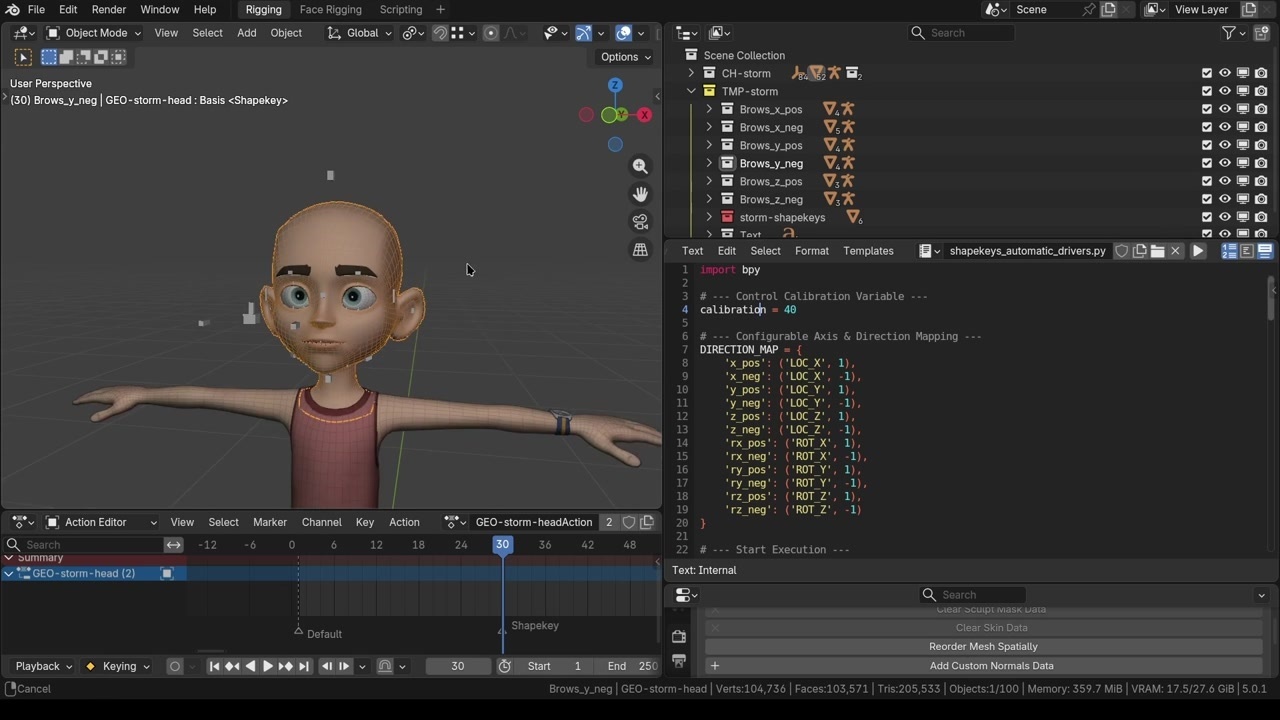 創建好 6 個形變鍵後,我們就可以開始將它們添加到綁定好的臉部網格上了。 Blender 5.0 新增了一些操作符,可以幫助我們同時產生和更新左右兩側的形變鍵。我們使用一個簡單的 Python 腳本,自動將驅動器分配到正確的骨骼方向。腳本可在此處下載。