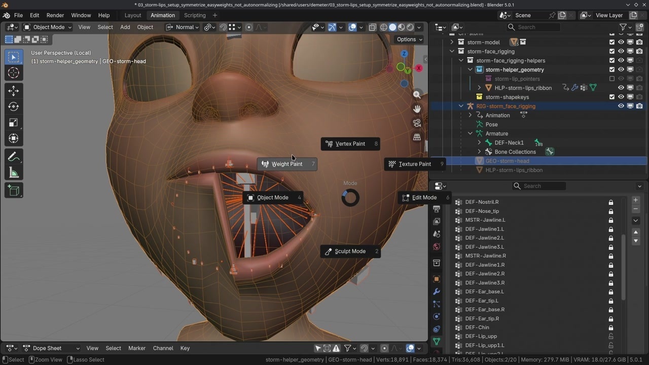 現在是時候開始為嘴唇添加權重了!一切準備就緒後,我們可以從主嘴部骨骼中減去權重,並將它們分配給每個單獨的變形骨骼。這樣就能得到一個變形平滑的嘴唇模型,同時讓動畫師可以自由地進行全局、局部或微調變形。